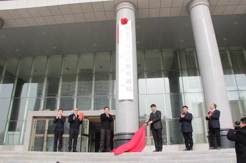 1月30日,阿克苏地区自然资源局挂牌,地委委员、行署常务副专员梁峰源和自治区自然资源厅人事处副调研员司马义·阿热甫共同揭牌。