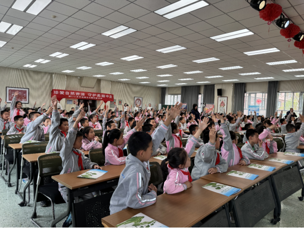 互动环节,“地球日知识有奖问答”点燃全场氛围。工作人员围绕世界地球日来历、自然资源保护、低碳生活、地质常识等核心内容设计题目,同学们踊跃举手、积极抢答,现场气氛热烈有序,答对的同学将获得精美礼品。在轻松愉悦的氛围中巩固了科普知识,强化了环保意识,实现了“寓教于乐、学用结合”。