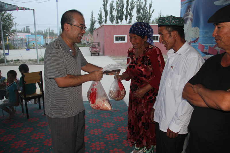 在古尔邦节到来前夕,为将喀什地委“暖心教育关爱”活动落到实处,使驻村群众度过一个欢乐样和的节日,厅驻喀拉玉吉买村工作队结合当前工作,提前谋划,安排部署,在节前开展了一系列走访、慰问和联谊活。向90名贫困户赠送了大米、清油等节日慰问品,并投入经费连同县政府拨款,为村里21户贫困家庭送去了过节的羊肉。将党的温暖和关怀送到村民家里。