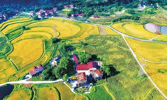 近年来,重庆市以国土综合整治为抓手,统筹推进山水林田湖草系统治理和美丽宜居乡村建设。图为2021年8月25日,九龙坡区西彭镇新民村国土综合整治项目区的水稻迎来丰收季。