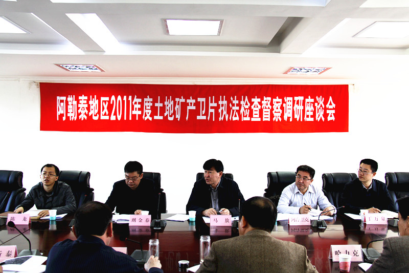 马敖•赛依提哈木扎厅长(前中)在听取阿勒泰地区2011年度土地矿产卫片执法检查和2012年国土资源重点工作开展情况汇报后讲话