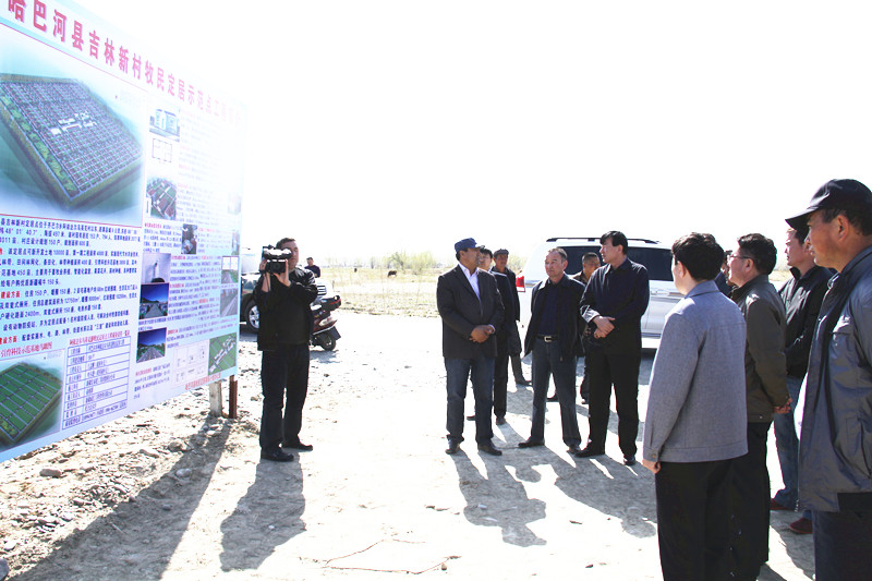 马敖•赛依提哈木扎厅长(右五)考察哈巴河县吉林新村牧民定居示范点建设用地情况