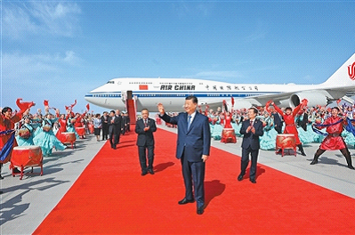14时20分许,习近平乘坐的专机在天山国际机场降落,等候在停机坪的新疆各族各界群众热烈欢呼。习近平走出舱门,向欢迎群众挥手致意。
