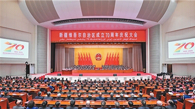 9月25日上午,新疆维吾尔自治区成立70周年庆祝大会在新疆人民会堂隆重举行。中共中央总书记、国家主席、中央军委主席习近平出席庆祝大会。王沪宁、蔡奇出席大会。