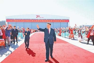 中共中央总书记、国家主席、中央军委主席习近平在乌鲁木齐出席新疆维吾尔自治区成立七十周年庆祝活动后,九月二十五日中午乘专机返回北京。这是习近平在乌鲁木齐天山国际机场向前来欢送的各族群众挥手致意。