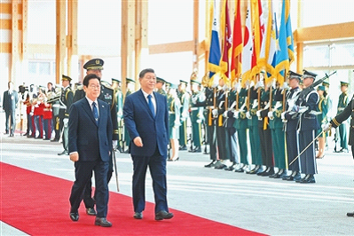 当晚,李在明同习近平小范围友好交流,并为习近平举行欢迎宴会。