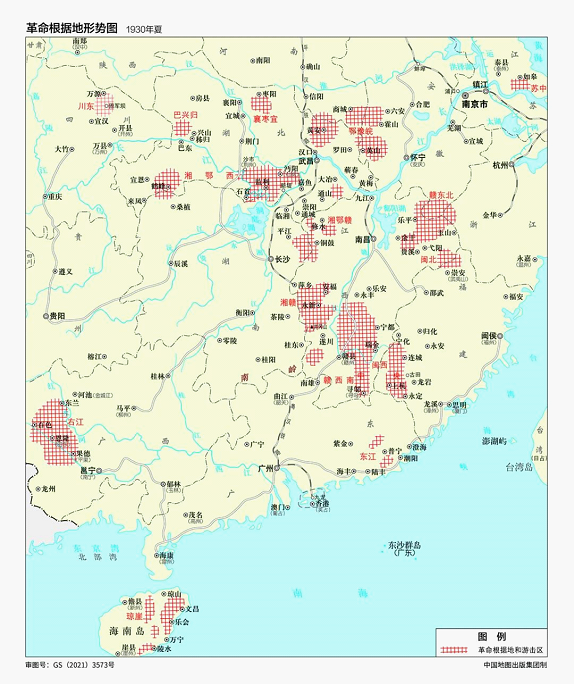 中国地图出版集团编制的《中国共产党100年地图集》即将出版,我们精选了一批珍贵的地图资料,开设《地图上的党史》专栏,带您回顾党的百年征程。今天,发布第十九期《革命根据地形势图》。
