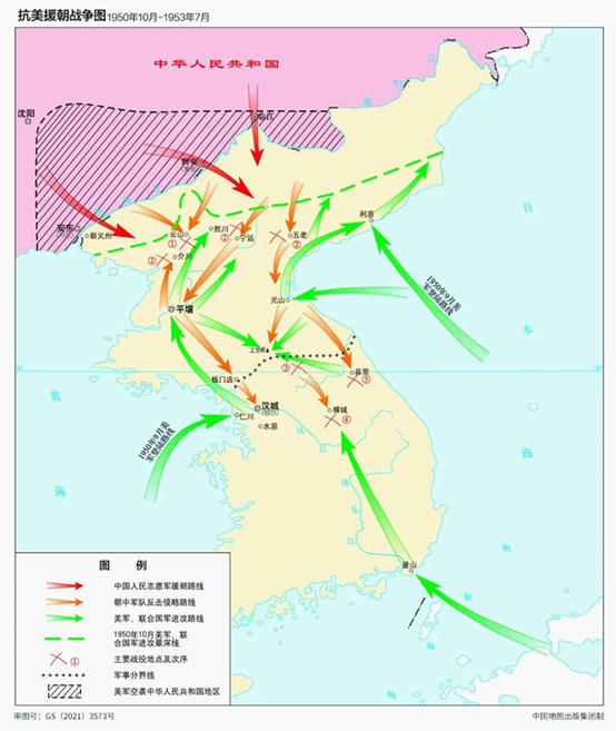 中国地图出版集团编制的《中国共产党100年地图集》即将出版,我们精选了一批珍贵的地图资料,开设《地图上的党史》专栏,带您回顾党的百年征程。今天,发布第四十二期《抗美援朝战争图》。