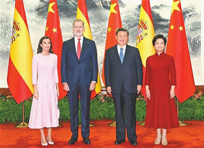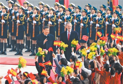 习近平欢迎费利佩六世国王访华,指出中国和西班牙都有深厚的历史文化底蕴。建交50多年来,两国坚持从战略高度和长远角度看待和发展双边关系,相互尊重、相互支持、相互成就,树立了不同历史文化、不同社会制度国家友好相处、共谋发展的典范,也为推动全球开放合作、维护国际公平正义发挥了重要作用。西班牙王室为中西关系发展作出了突出贡献。在两国迎来建立全面战略伙伴关系20周年之际,费利佩六世国王对中国进行国事访问,对推动两国友好合作不断向前发展具有重要意义。